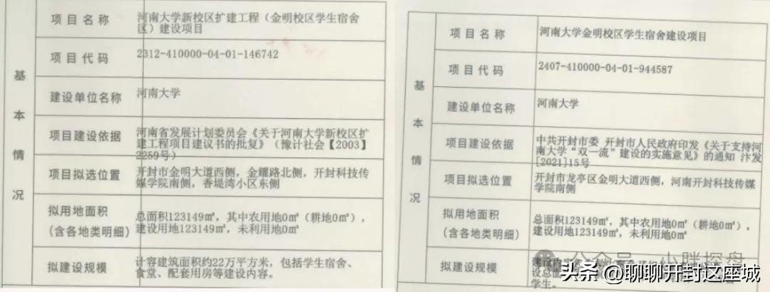 2024年7月25日,再次公示河南大学新校区扩建工程(金明校区学生宿舍区)建设项目用地预审与选址意见书。对比两次公示文件,略显不同的地方应该是:此前的项目建设依据为河南省发展计划委员会《关于河南大学新校区扩建工程项目建议书的批复》,本次的依据为中共开封市委开封市人民政府印发《关于支持河南大学“双一流”建设的实施意见》。此外,不同之处还包含:增加了容纳15338名学生。