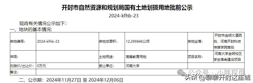 2024年11月27日,以高等教育用地划拨的形式将河南大学金明校区学生宿舍建设项目划拨给河南大学并进行批前公示。公示期为2024年11月27日 至 2024年12月06日。