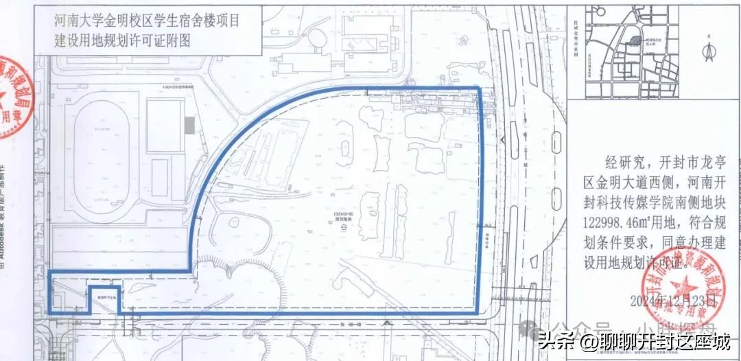 2024年12月23日,公示河南大学金明校区学生宿舍楼项目建设用地规划许可证。其中,明确用地面积122998.46㎡,建设规模230555㎡。该证有效期1年。如需延期,需在有效期满前30日到发证部门办理延期手续。
