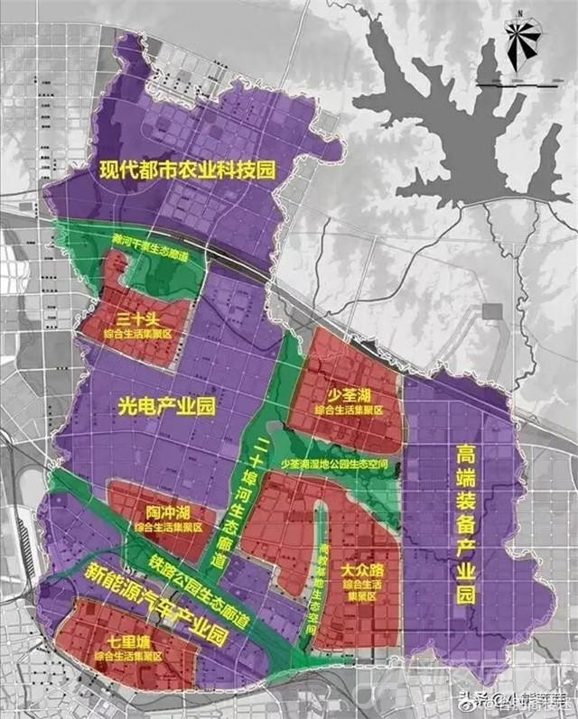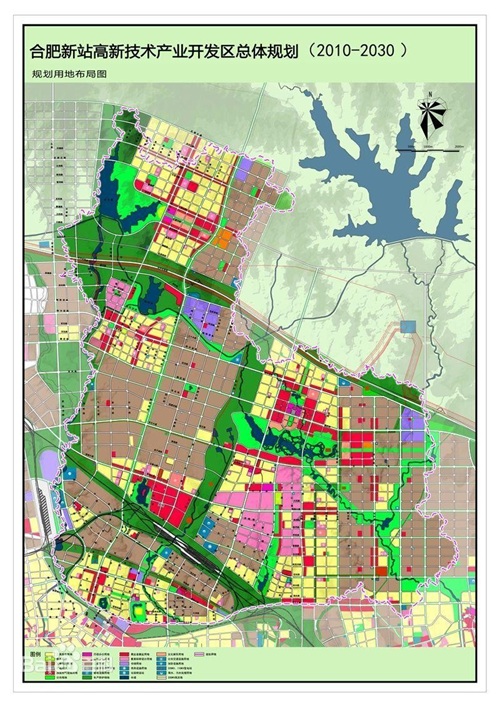 从图中可以明显看出新站高新区目前的板块分布及产业分布,五大板块四大产业一目了然,并且还将建三条生态廊道和两个生态空间