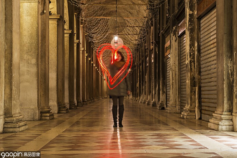 接下来是一些难度稍大的比心方式,例如图中摄影师利用延时摄影的手法拍摄的比心图,图中的女生手里拿着一根蜡烛,用蜡烛的灯芯在空中画出心的形状。