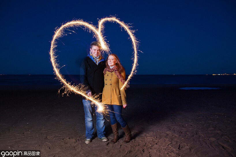 手里拿着烟花也可以利用延时摄影拍摄花式比心的图片,情侣两人紧紧依偎着,男生手拿烟花在空中画出心的形状,这颗心将两人包裹起来,是不是很浪漫呢。