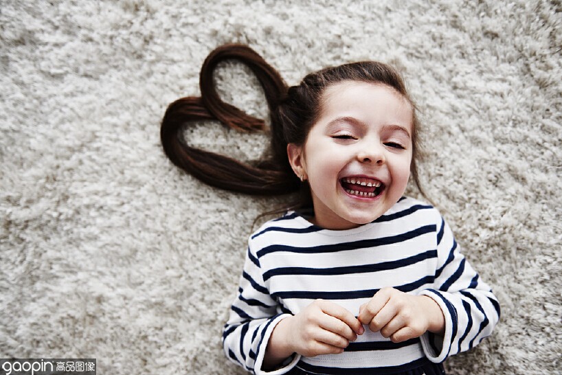 除了利用我们的肢体来比心之外,我们还可以借助一些道具来花式比心。图为一个躺在毛毯上的小女孩,她的长头发被摆成了一个心的形状,这样的比心方式显得小女孩更加可爱。