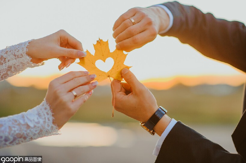 借助树叶比心也是别出心裁的比心方式,将树叶中间抠出一个心形的空白区域,一对相爱的情侣分别拿着树叶的两端,这样的比心方式也很独特。