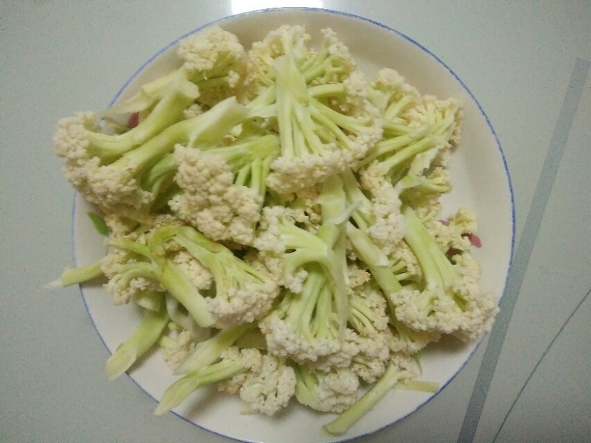1:菜花去梗、掰成小朵、把水里放点盐,泡一会捞出、清水中放点面粉或是淀粉再放入菜花泡一会捞出,用清水冲洗干净备用。