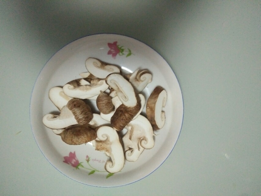 2:香菇去蒂,盆中倒入清水,加入盐,放入香菇泡十分钟,捞出用清水冲洗干净,沥干水分,切成薄片,备用。