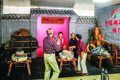 11日,游客在桂林米粉文化中心跟传统桂林米粉制作用具合影。