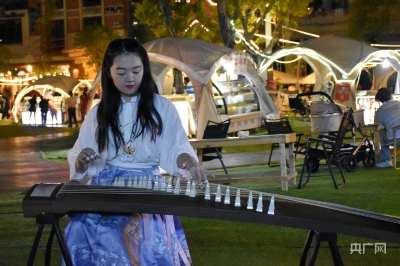 在马岭河夜间文化和旅游消费集聚区,表演者正在弹奏古筝(央广网见习记者 杨贇 摄)