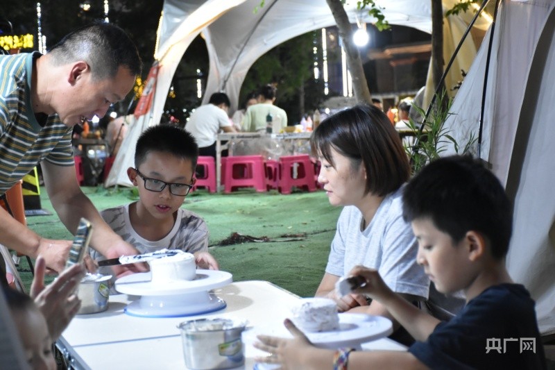 马岭河夜间文化和旅游消费集聚区内,小朋友们认真学习制作蛋糕(央广网见习记者 杨贇 摄)