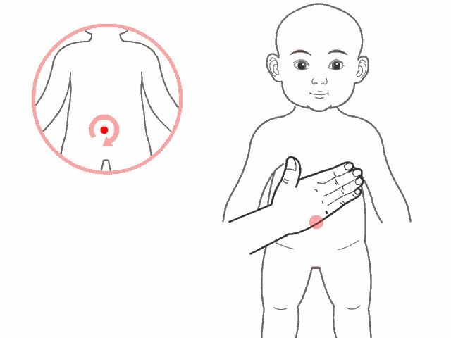 小儿推拿手法:以食、中、无名三指,揉动小儿肚脐直上方4寸位置之中脘穴,反复约30-50次。