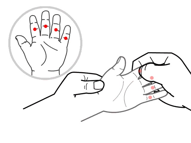 位置:在掌面示、中、环、小指掌指关节横纹处。