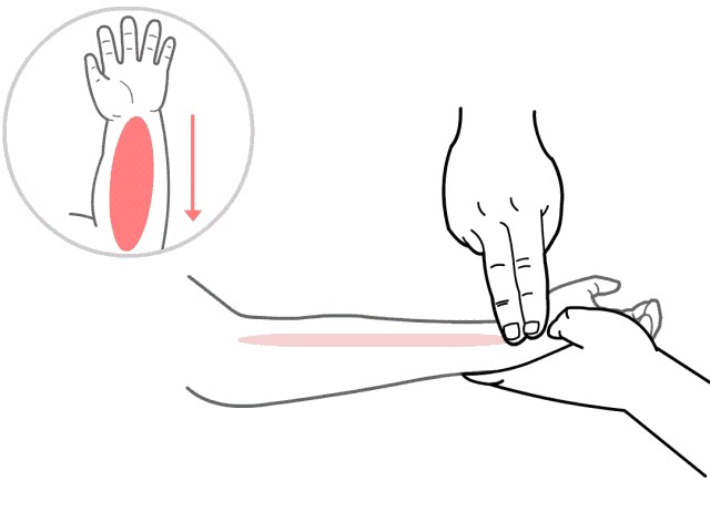 小儿推拿手法:用一只手握住孩子的手腕,使其掌心向上,然后用中指、食指指腹自孩子腕横纹推向肘横纹,直推300-500次,推的方向一定是从腕到肘,不可反向操作!