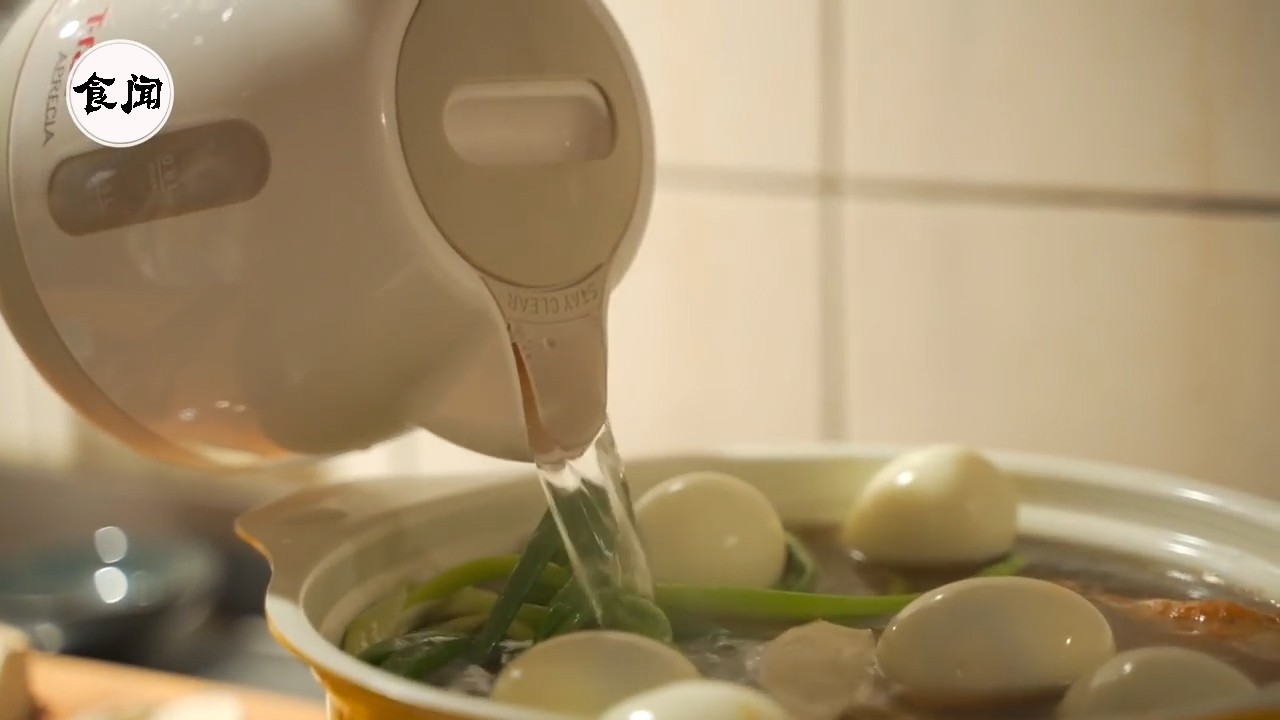 14、其实卤焢肉的时候也可以同时卤鸡蛋的呢,最后放1500毫升的水盖上锅盖大火烧开,水和酱油的比例是5:1,但是每一家酱油的咸度不一样,所以也要适量的看一下呢;