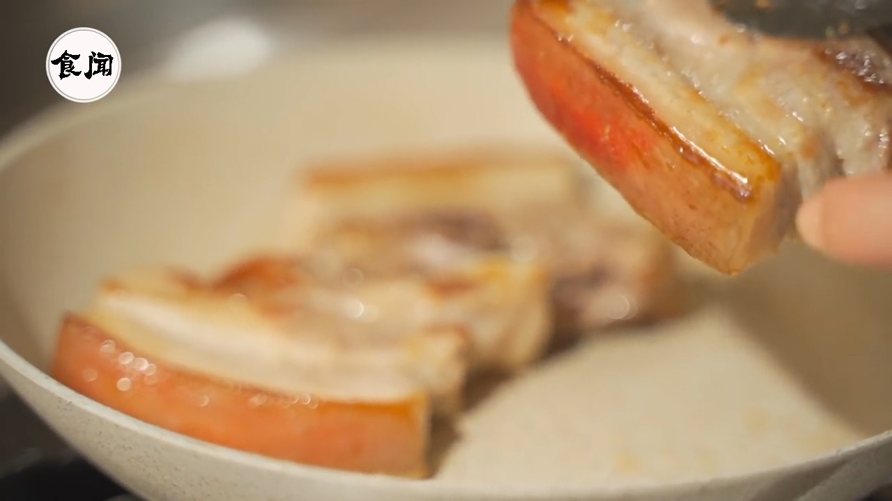 3、煎五花肉记得翻面不要那么勤快,煎到金黄再翻;