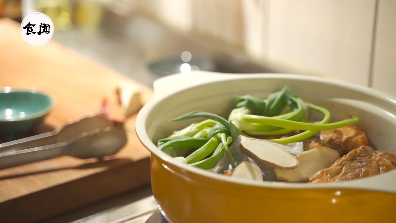 13、把青葱、姜片也一起放进卤肉锅里面;