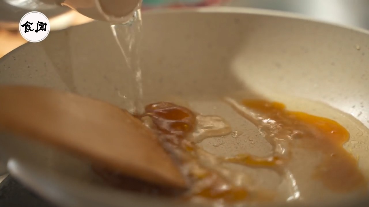 9、冰糖炒到这样的糖色之后就开始加水了,热水不要一次加那么多要分次加,这样冰糖才更好的溶解到水里;