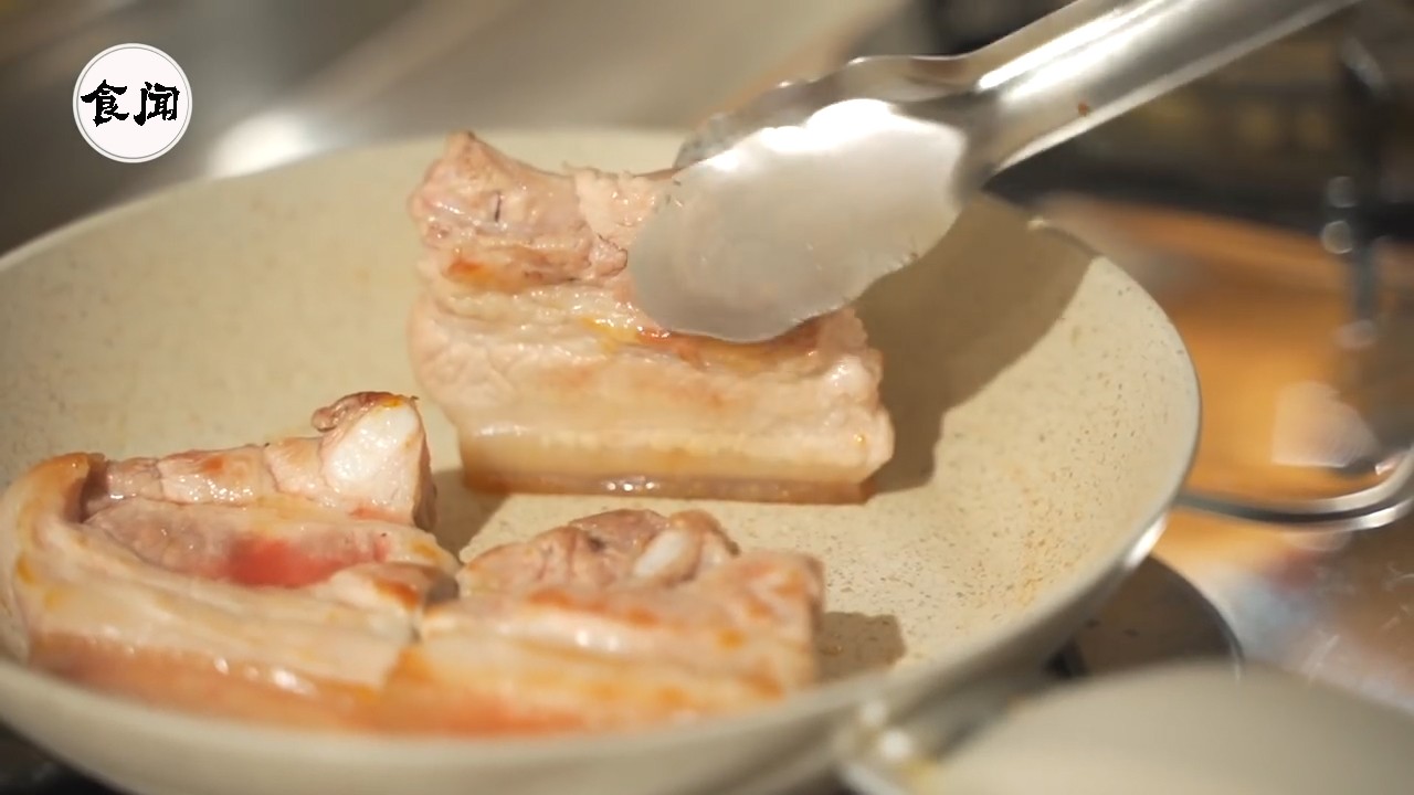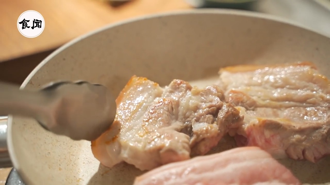 5、不用翻得那么勤快,就像煎鱼一样不用急着翻面,等到五花肉煎到这样的金黄就可以翻面了,另一面也是一样的煎法;