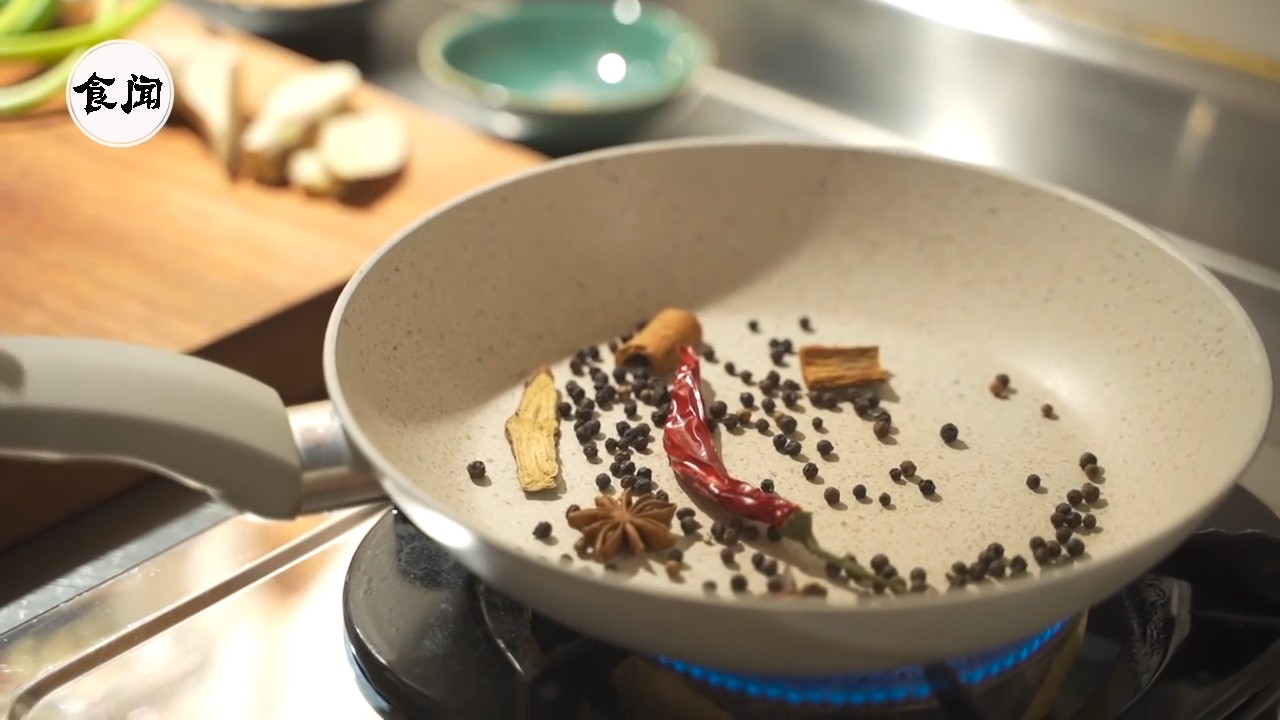 3、把清香料放进锅里翻炒,不用放油炒哦,香料炒香了就放旁边备用;