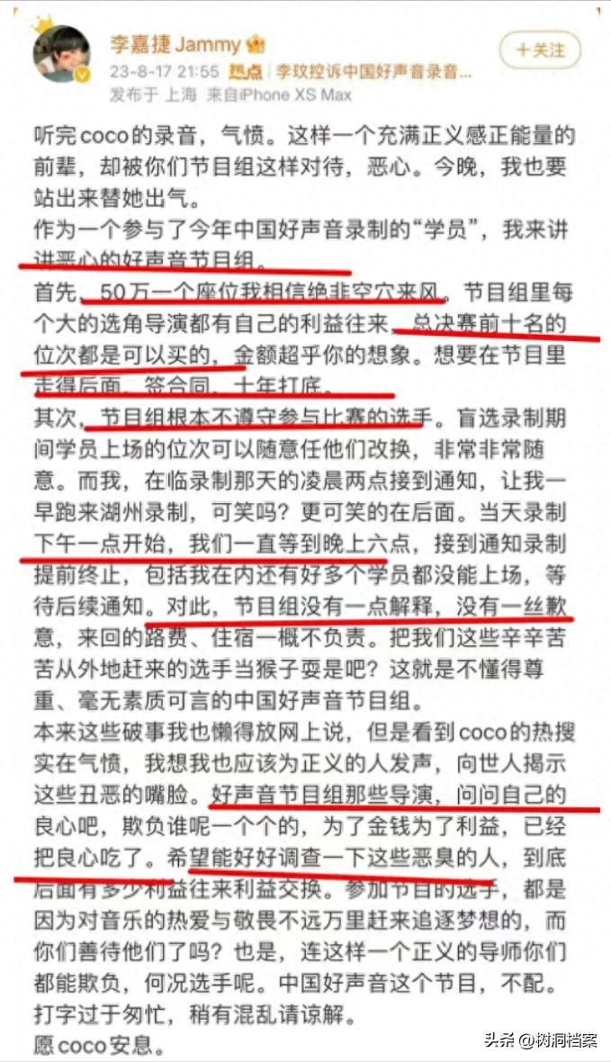 还有之前李玟的学员李嘉捷也在平台上为李玟打抱不平。并爆出节目组惊人内幕,10万就能在节目上露脸,50万换来一位导师给你转身,甚至总决赛名额也是可以用钱轻松到手。