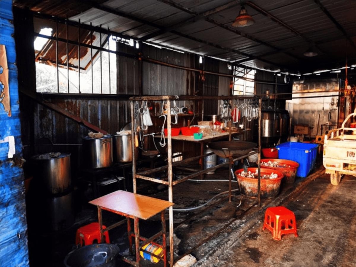 小黑房里,恶臭扑鼻,20多个大塑料桶里全泡着羊下水,血污、油污遍地。