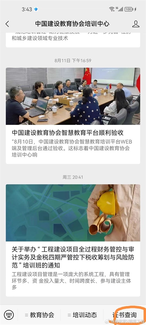 施工员证的查询方式有两种,第一种是扫描证书上的二维码,点击证书查询,输入姓名,证书编号,身份证号码,即可查到电子版本的证书了;第二种是在百度上登录中国建设教育协会培训中心的官网,点击证书查询,输入姓名,证书编号,身份证号码就可以查到证书的相关信息了。