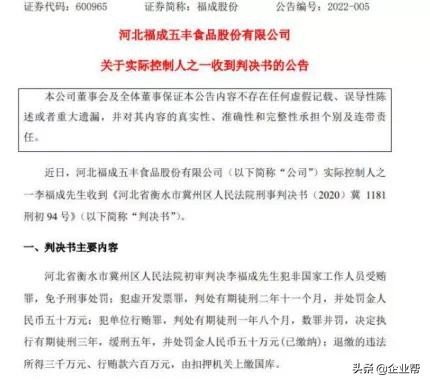 李福成(福成股份实控人之一)因犯行贿罪、虚开发票罪等被判有期徒刑三年,缓刑5年,并处罚金人民币五十万元(已缴纳),退缴的违法所得三千万元、行贿款六百万元,由扣押机关上缴国库。