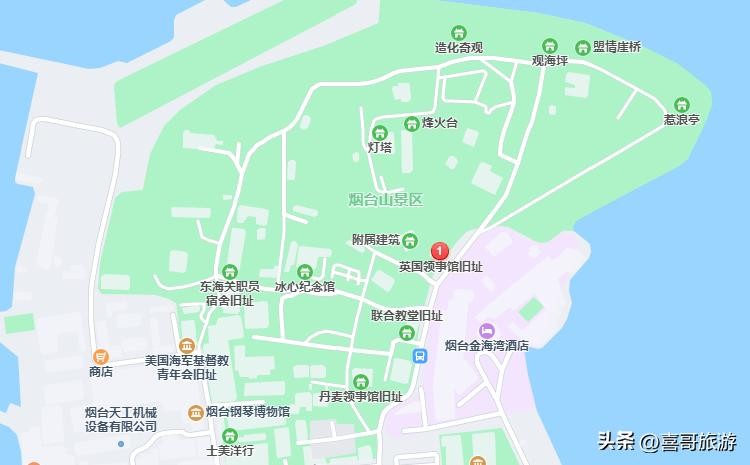 景区内及周围建设有领事馆、洋行及众多别墅,成为亚洲唯一保存最完整、最密集的近代外国领事馆群。山顶的灯塔是烟台市内最高点,可以乘坐灯塔内的电梯上到11层瞭望台,在这里远眺大海、欣赏海岸线及城市风光。