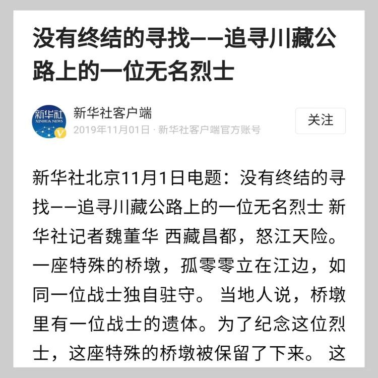 去年11月1日新华社有一篇《没有终结的寻找,追寻川藏公路上的一位无名英雄》的报道,全文如下: