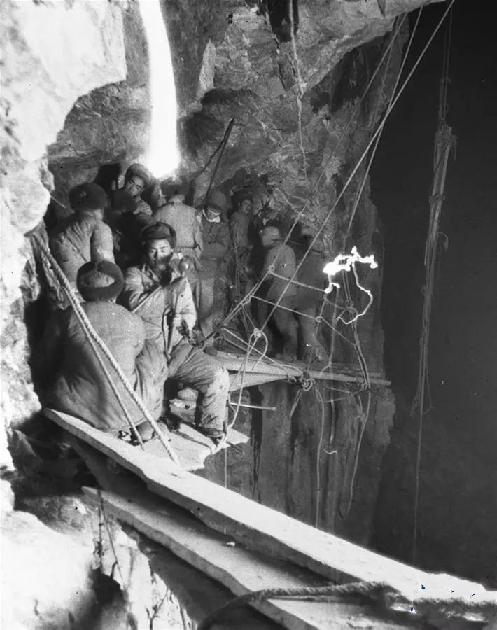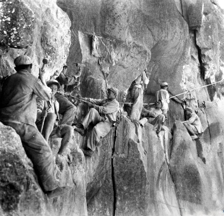 筑路战士在怒江两岸的悬崖陡壁上辟山开路。图源:新华社