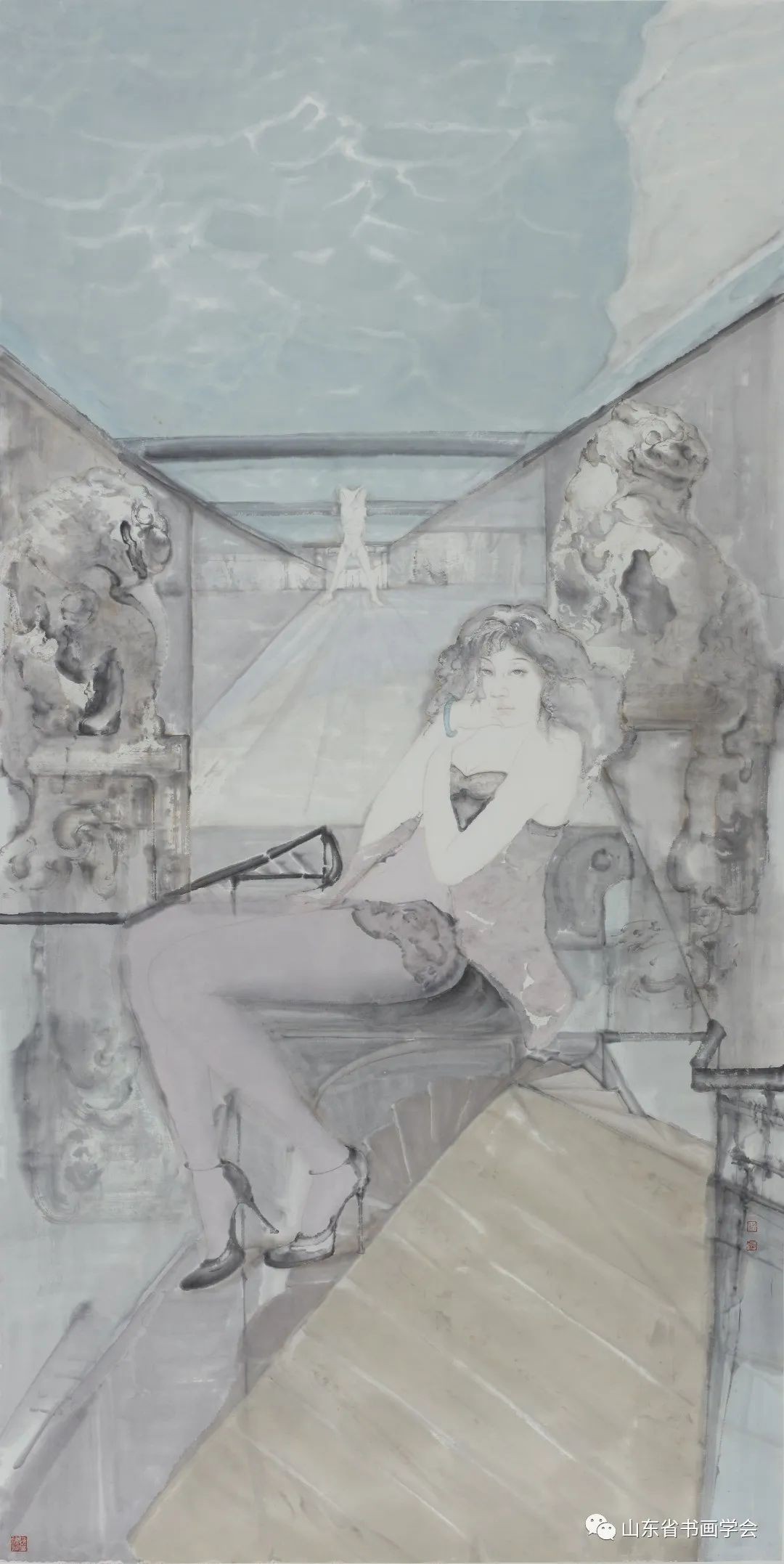 孙春龙的绘画在这个方向上与他的老师张望保持着一贯之的审美追求与艺术理念。孙春龙的水墨艺术特点,是他在最大程度上将中国传统古典美的理念与现代性,融合为一种现实意义下的审美。在他的作品里,淑女的静穆端庄与慧觉的有情,有着臻于完美的结合。他所塑造的人物形象,是一种现代文明与古典文化交融下的恰当呈现。也就是既有西方古典油画的高贵——维米尔的细腻典雅,又有东方词韵诗意的优雅——知性的经典与低吟。