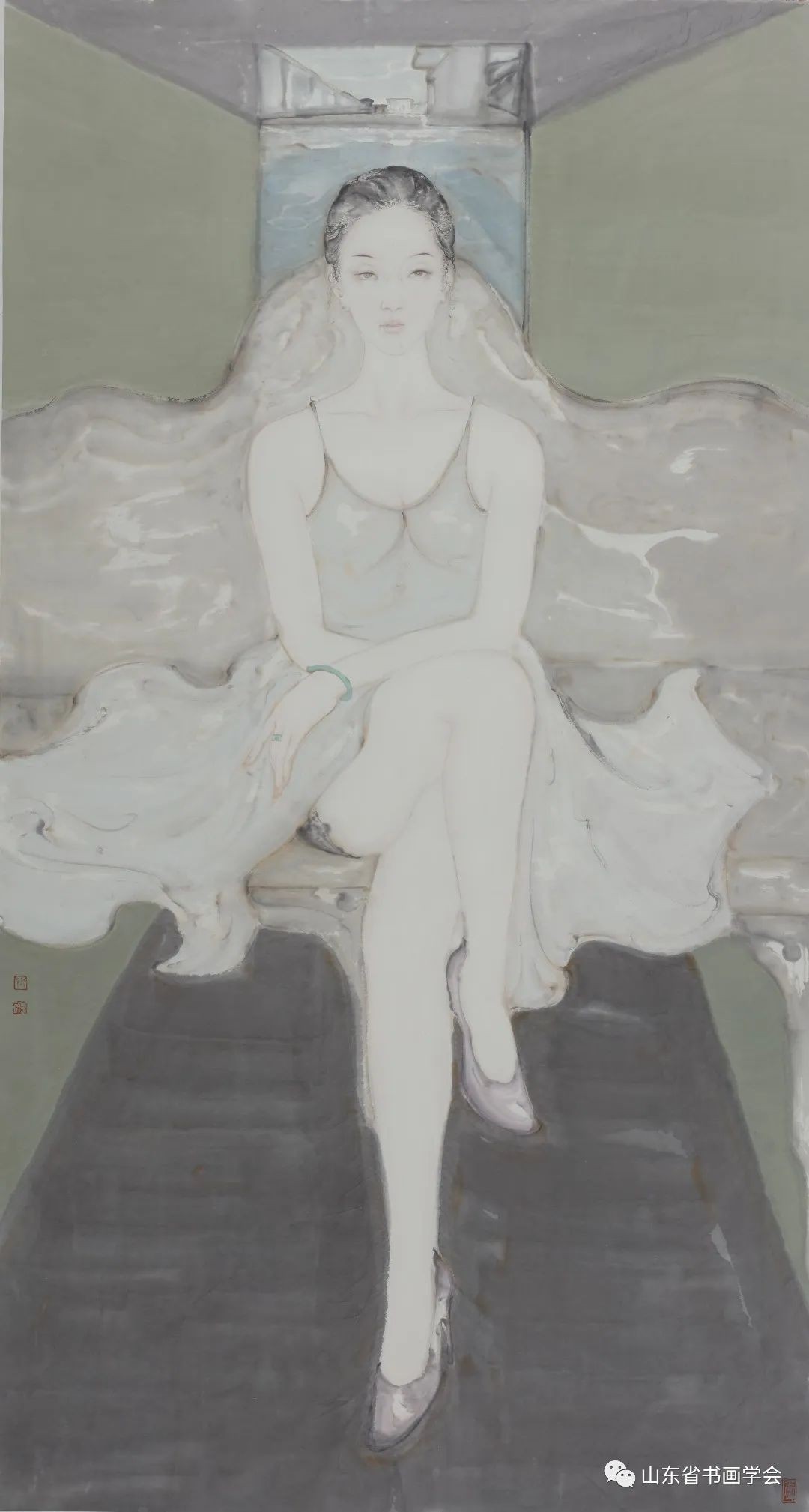 他画了很多当下的女青年,虽然是新时代的人物,但造型之美妙,确乎是传达出了古典美的诉求——总是保持态仪的端庄与善美。孙春龙不是将笔墨的应用停留在对女性的美貌刻画上,停留在形式的表面处理上。譬如他力求简洁,不求烦琐来表达对素面的唯美理解——女性在长久保持心态的平稳的状况下才会有的一种完美——不认为自己美而美,是大美——天地有大美而不言。