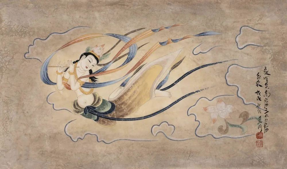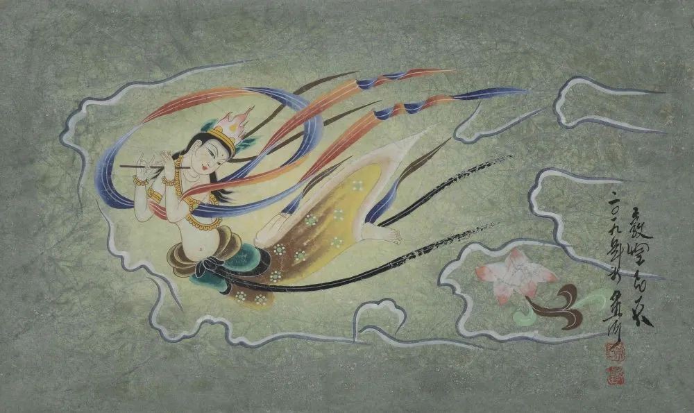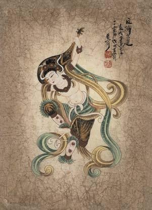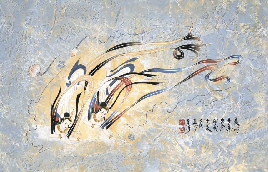 “飞天”系列是敦煌壁画中的代表,李白有一首咏赞敦煌飞天仙女的诗描写得极为形象:“素手把 芙蓉,虚步蹑太空。霓裳曳广带,飘浮升天行。” 黄有为笔下的这幅《飞天》取自敦煌莫高窟 321 窟,在有限的画面中,表现了无边无际的茫茫太空, 两飞天昂首挥臂,翔游太空,手持莲蕾,直冲云霄,从空中徐徐而来,并肩遨游,舞带随风悠悠漫飞。在一种别有情趣的浪漫意境中表现出佛教的安乐与祥和。在飞天系列绘画中,黄有为注重造型构图、线条勾勒、色彩渲染、人物神态的完美呈现。比如,他 在线条的运用上已经找到属于自己的表现方式,曲直结合,复杂多变,具有十足的艺术张力。他作品中 飞天都是那么的神圣、优雅,这种真情弥漫的感染力给我们带来出世般的愉悦和清净。这恰恰是黄有为 审美理念的高度升华和艺术理想的集中体现。