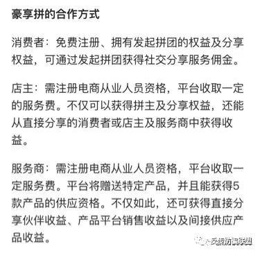 那么,中君推出的豪享拼到底是什么?有什么特色?据相关宣传资料介绍,该平台开创“三人拼”、“五人拼”模式,将合作伙伴分为三个等级:消费者、店主、服务商。通过注册各种等级,平台将收取一定的服务费,等级越高,参与利益分红也就越多。