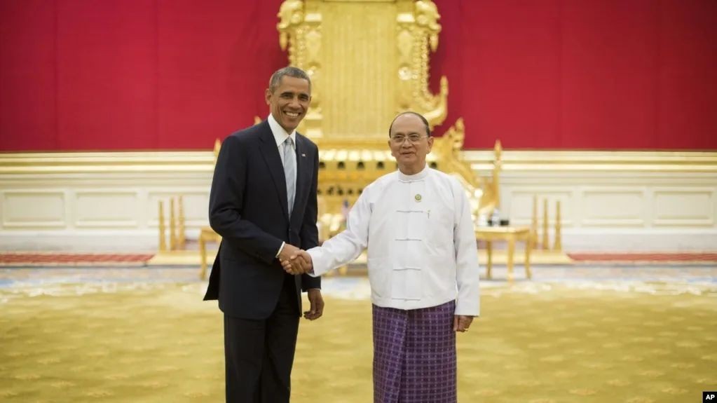 奥巴马访问缅甸期间会见吴登盛,2014年。缅甸民主化进程是奥巴马政府极力宣传的一大政绩。