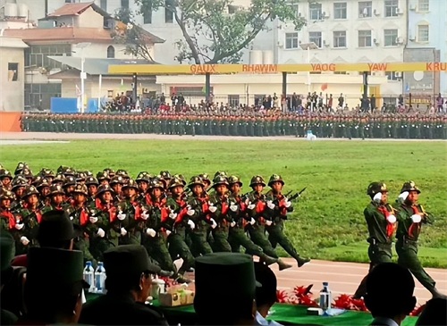 佤邦三十周年大庆阅兵式上鲍有祥检阅部队,2019年4月17日。佤邦拥有55万人口和3万军事武装,是缅北各路藩王之首。