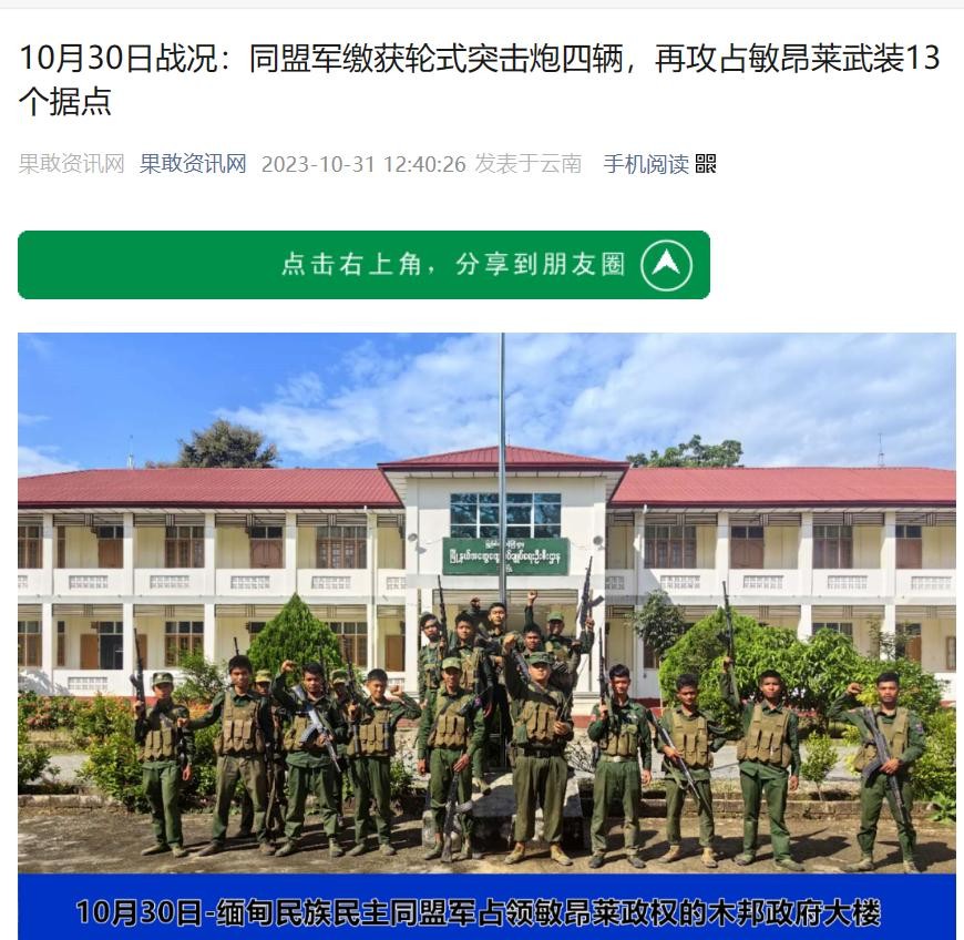 根据果敢资讯网10月31日的报道,盟军在勐古、果敢及木邦战线与缅甸政府军交火,共攻克大小据点80个,缴获包括轮式突击炮在内的军事物资一批,并声称已占领多条主要道路。