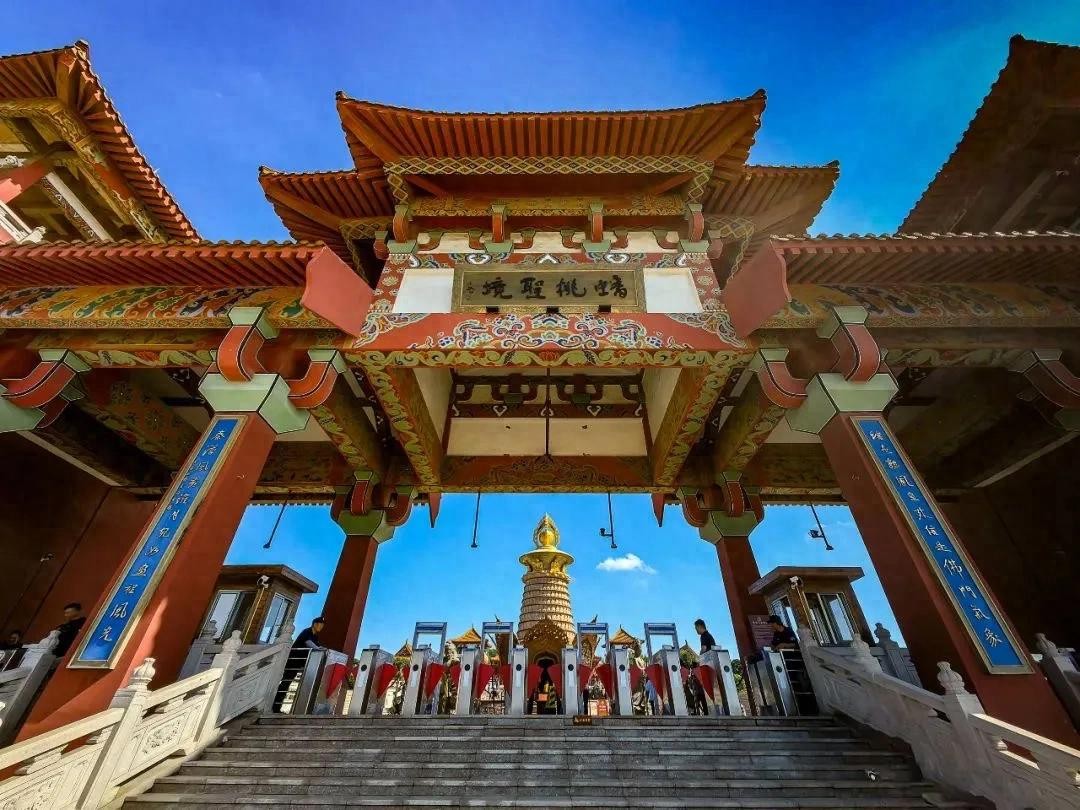 三是通天阁高59.88米,是国内最高的佛阁,供奉着弥勒菩萨真身——天冠弥勒;