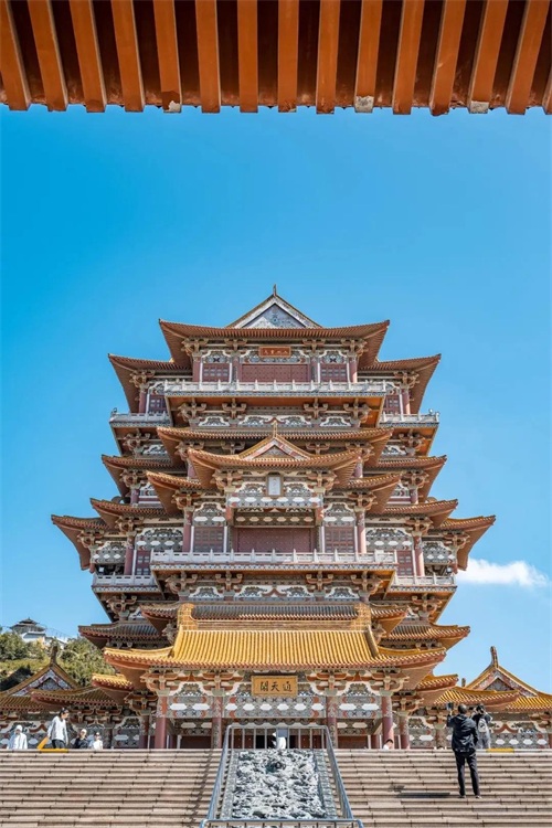 佛堂大殿中矗立的铜像,法相庄严的佛陀,庄重而威武;亭台上绽开的宝莲,出淤泥不染,花开佛性显;佛堂簇拥的通天阁,直插云霄,萦绕在山尖与缭绕的云雾间,楼外漆彩饰,阁内藏金身,是大宏愿也是大慈悲……