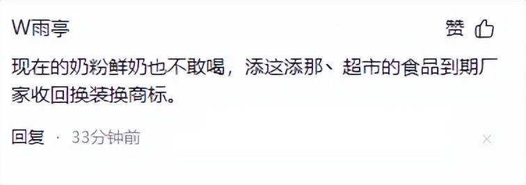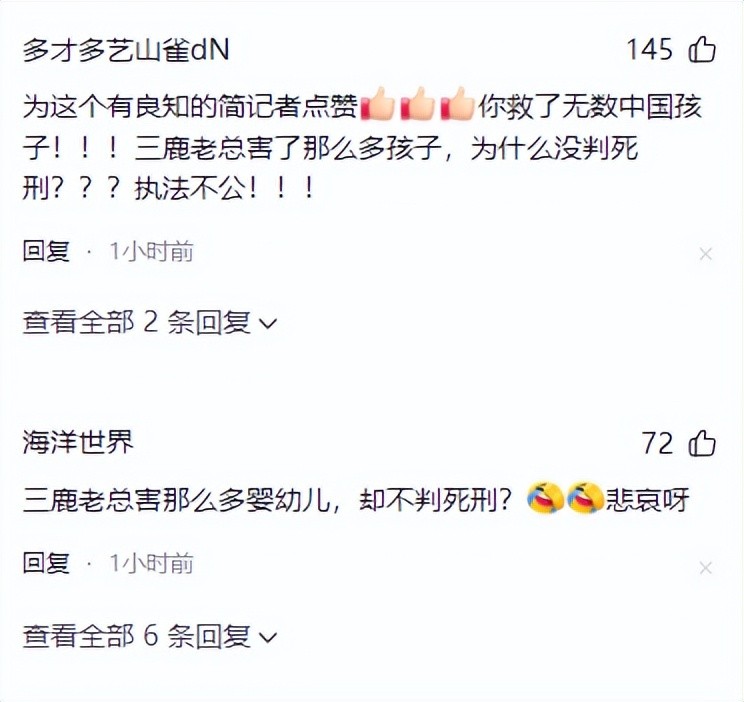 并且还有网友评论称,当时有一种说法是,有些奶农加了三聚氰胺是为了提高蛋白质含量,三鹿公司在收购奶农鲜奶时混着有添加三聚氰胺的鲜奶,当时没有要求检测三聚氰胺标准,可预计奶农普遍存在添加三聚氰胺行为,三鹿公司作为生产奶粉生产商有不可推卸责任。