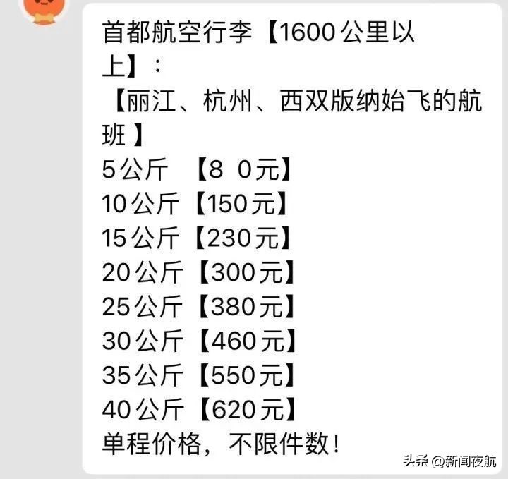 记者采访了让乘客购买行李服务的航空公司,相关负责人告诉记者:“旅客购票后我们都会发短消息通知。在OTA网络购票渠道购票时,也有行李托运政策内容展示。航程800公里(不含)以下12元/斤,航程800公里—1600公里(不含)16元/斤,航程1600公里以上20元/斤。”