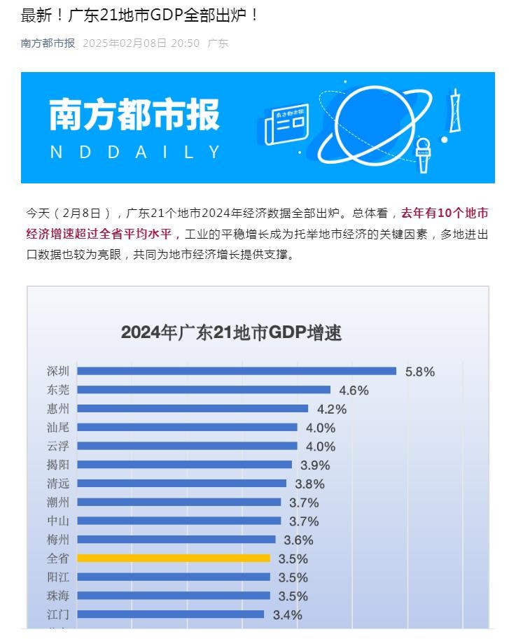 深圳以5.8%的增速领跑全省,东莞、惠州等城市紧随其后,但广州、佛山等传统经济强市增速放缓,都低于全省的平均值。