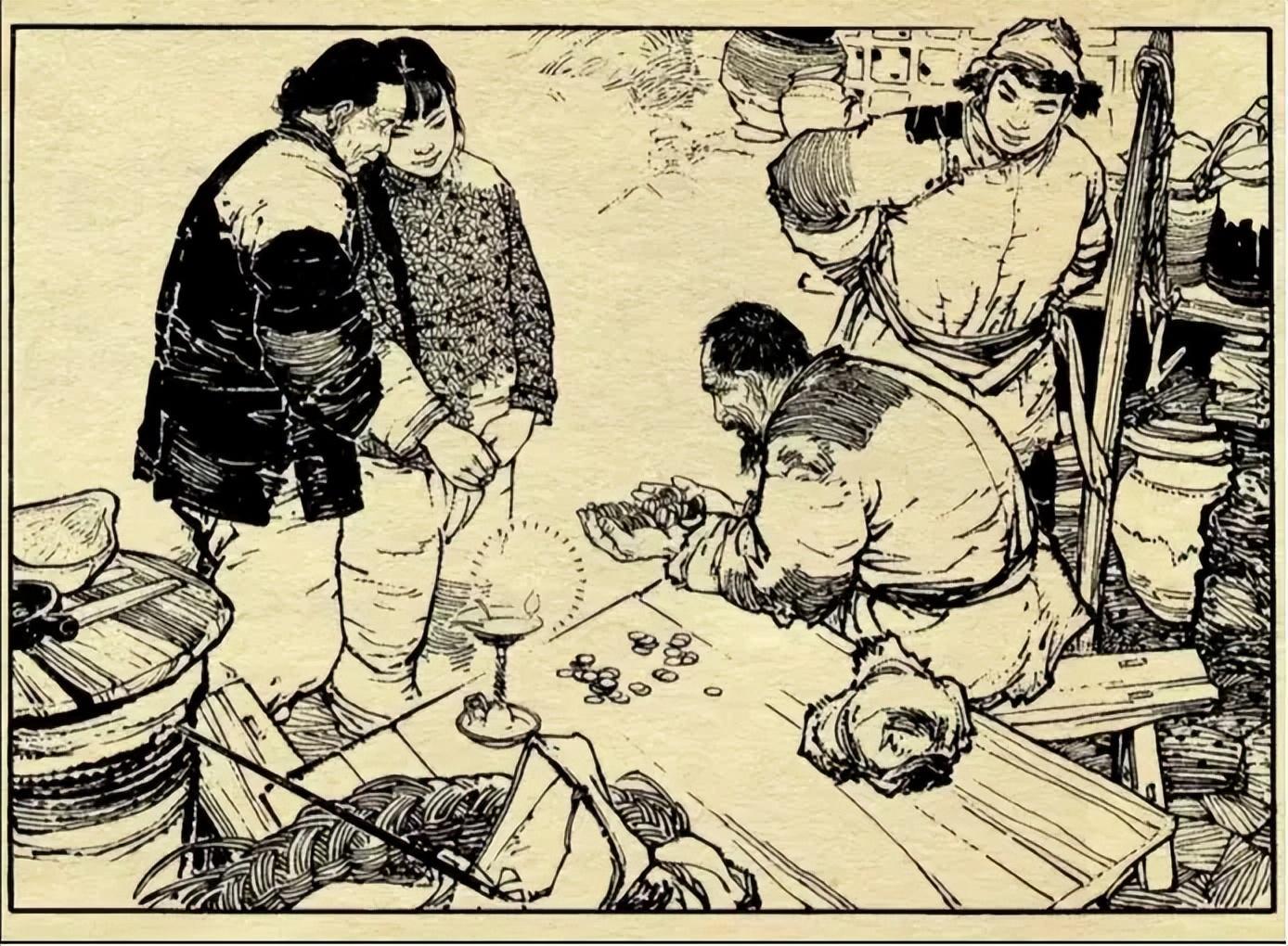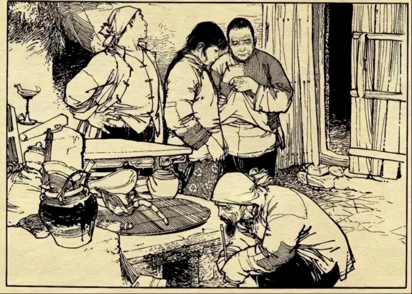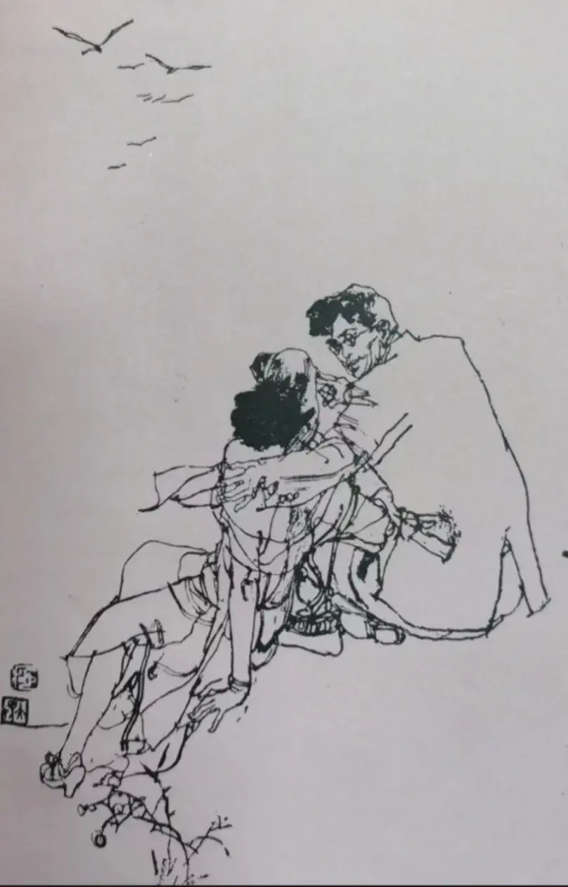 上面借敦煌线描稿说了线条的处理,从连环画则可以学到构图的常用技巧,简单来说就四个字——聚散关系。可以看到每一张完整的构图中,都能找到线条聚拢的、信息量大的、刻画精致的部分,也能找到线条稀疏的、信息量小的、刻画简略的部分。相互对照,产生聚散关系,从而就能引导人的观看路径和欣赏重点。