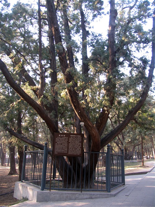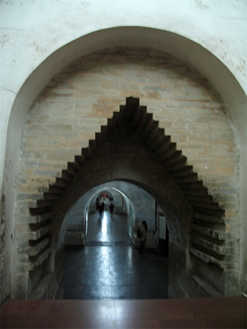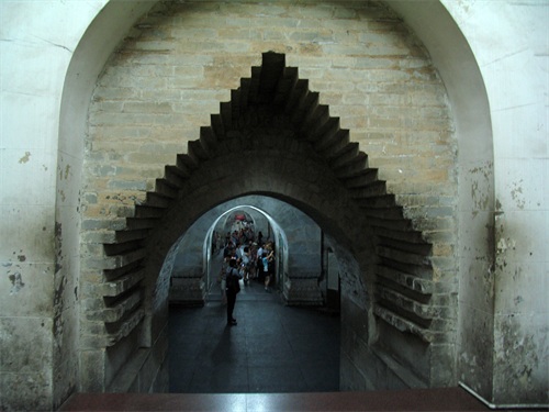宝城在明楼的后面,是一道用城砖垒起的圆形大墙,墙上有垛口,城墙高7.5米,上厚下薄,周长800米,在它围绕的中间有一个人工堆成的大土丘,其实就是皇陵的坟头,叫做宝顶。宝顶下是地宫。宝城掩映在苍翠的山峦松柏之中。定陵宝城内有对鹿角柏是不能错过的,鹿角柏,又称帝王柏,据说树龄远远超过定陵的修建年代,显然这对柏树是当年修建定陵时从别处移栽过来的。两株造型奇美的鹿角柏,雄踞南北,充分显示了古代帝王九五至尊的显赫地位。沿着指示牌指引的方向,就来到定陵地下宫殿。