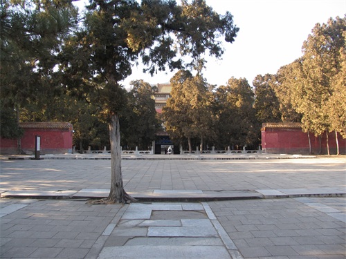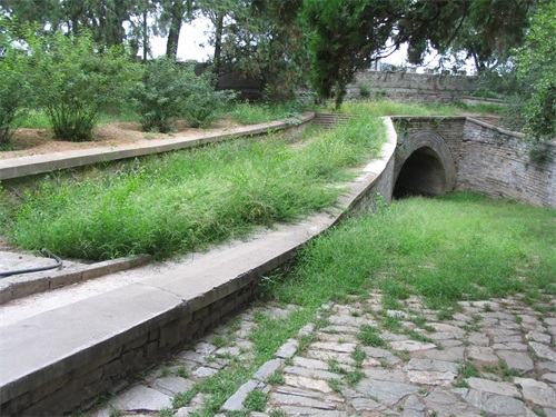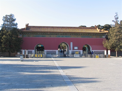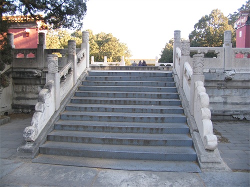 继续向北走,是定陵的陵门入口,陵门为单檐歇山顶式,制如外罗城门,黄瓦、朱扉、设券门三道,其左右各设有随墙式掖门一道。进大门后我们首先看见的是祾恩门遗址,位于祾恩殿前。定陵的祾恩门和祾恩殿在清兵入关时遭到严重破坏,现仅存两处台基,分别为祾恩门和祾恩殿遗址。祾恩门遗址面阔五间,进深二间,下承一层须弥座式台基。台基之上龙凤望柱头式的石栏杆,前后还各设有三出踏跺式台阶。