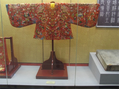 孝靖皇后的百子衣:定陵孝靖皇后的“红素罗绣平金龙百子花卉方领女夹衣”和“红暗花罗绣‘万寿’字过肩龙百子花卉方领女夹衣”,均方领,对开襟。从图案的设计看,所绣百子画面精彩生动,绣工精巧,技艺精湛,是两件难得的刺绣艺术精品和艺术瑰宝。