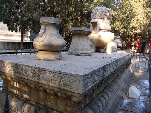 从祾恩殿遗址的台基下来,穿过沿中轴线的一座棂星门,移步前行便来到了石五供。石五供为象征性祭器,有香炉(一座)、烛台(二座)、花瓶(二座)置于石祭案之上,具有烘托陵寝纪念气氛的作用。抬头望去,在石五供后面便是明楼。从方城城墙拾阶而上,就来到明楼。