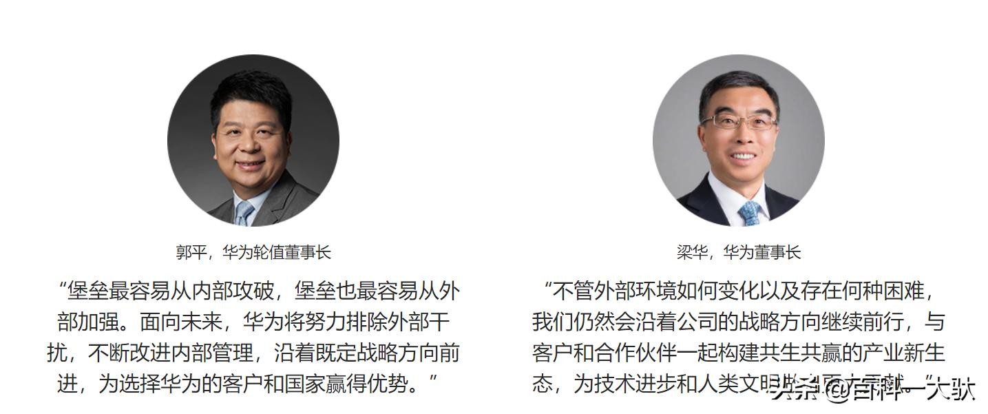 董事长:梁华副董事长:郭平(轮值董事长兼)、徐直军(轮值董事长兼)、胡厚崑(轮值董事长兼)、孟晚舟(首席财务官兼)