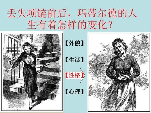 经过十年的努力,玛蒂尔德通过努力还清了债,获得了真的项链。当佛来思节夫人说出真相给她当头棒喝的时候,她本人也才如同这条真项链一样完成了价值的升华。