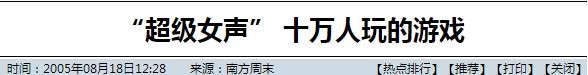 也不怪张碧晨的父母没信心,在2005年那个选秀节目横行的年代,《超级女声》的总报名人数超过了10万。