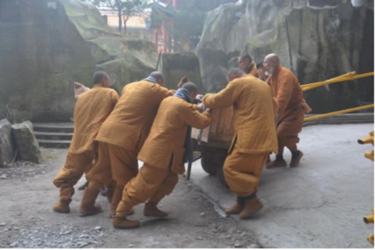 (出家师父为建设寺院搬木头)